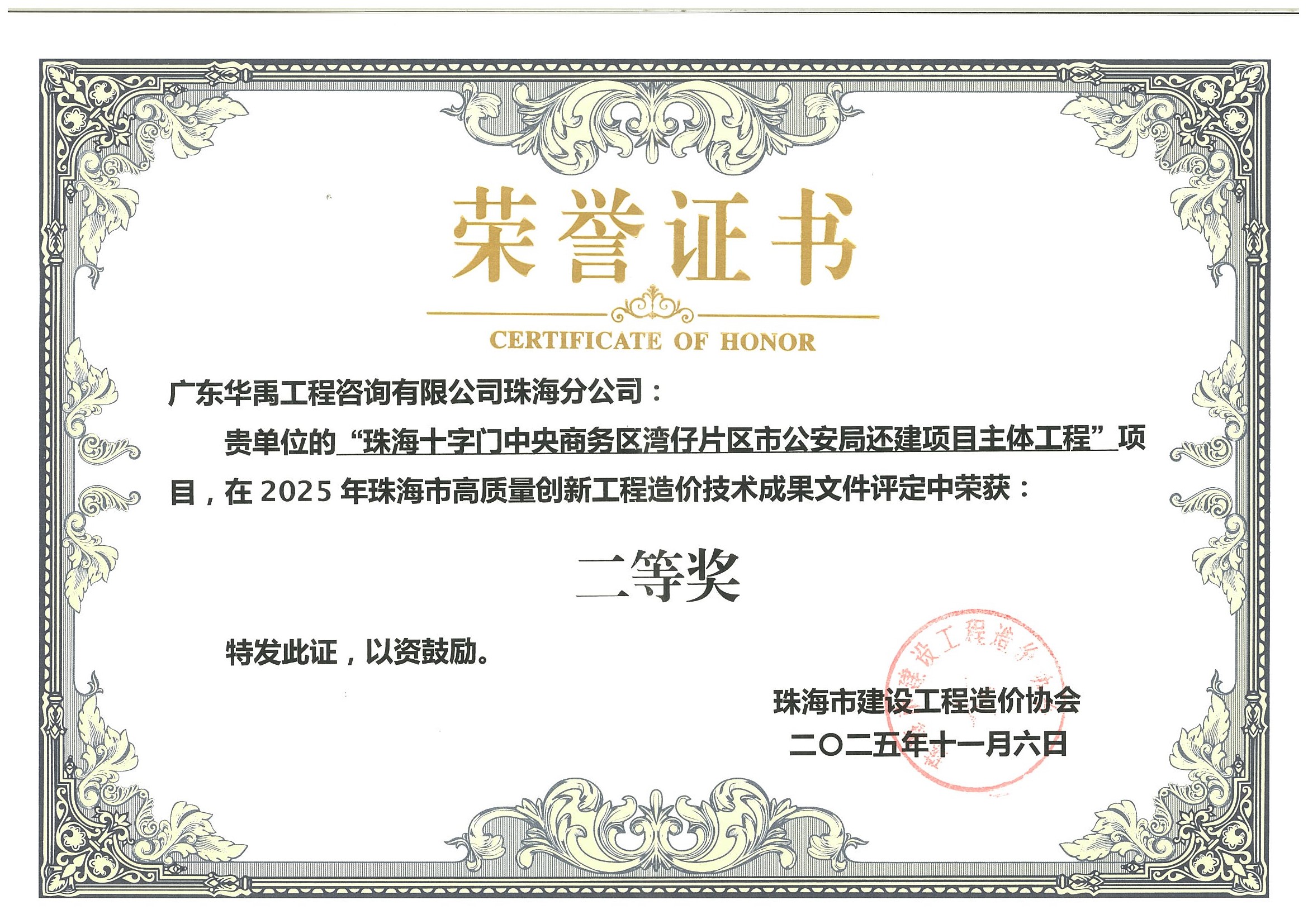 珠海机场综合交通枢纽项目二期B工程(珠海机场酒店一期)二标段获2024年珠海市高质量创新工程造价技术成果文件二等奖